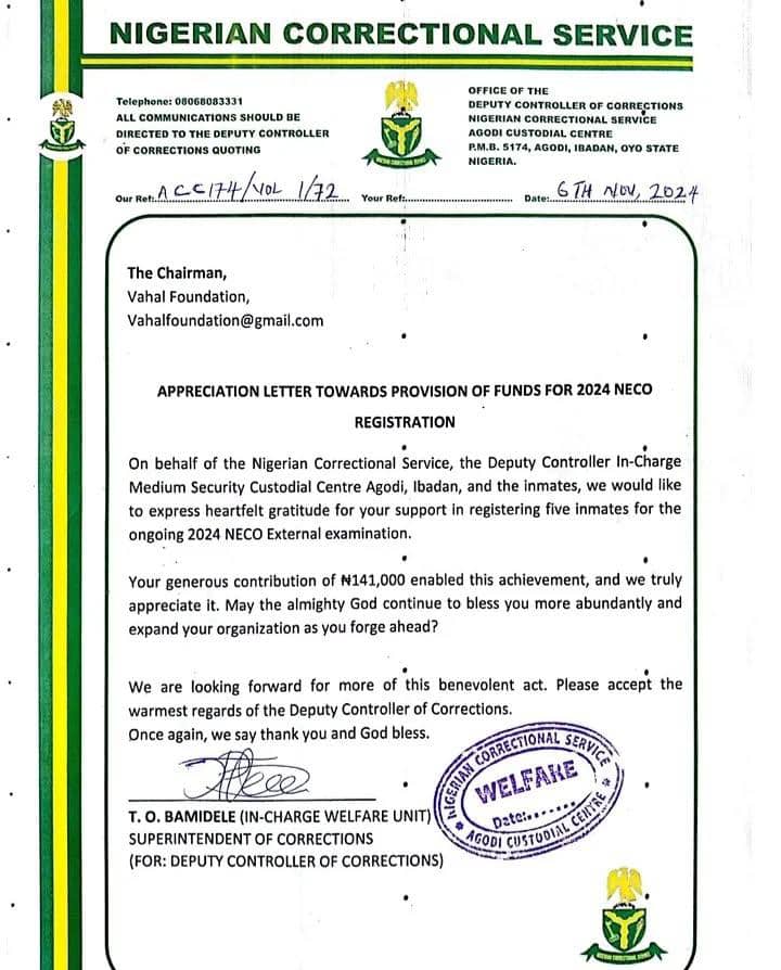 In 2024, Vahal Foundation took a step towards empowering individuals in correctional centers by sponsoring FIVE inmates for the National Examinations Council (NECO) exam. This…